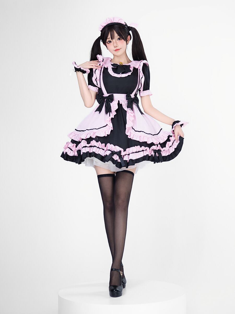 【黒×ピンクで甘辛かわいい】猫鈴付きロリィタ風メイドコスチューム5点セット|フリルたっぷり×ふわスカート|視線を集める小悪魔メイド|アニメコスプレに♡