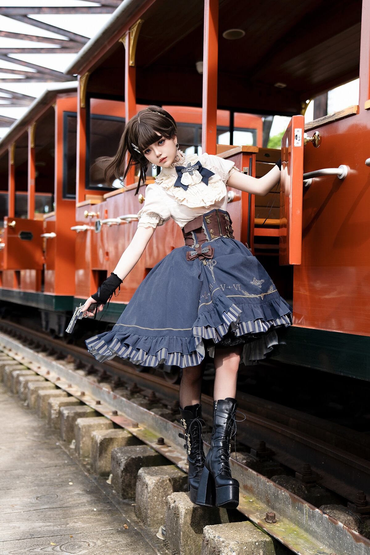 アンティーク調金具と編み上げ仕様のコルセットが、気品とスチームパンクの雰囲気を両立。ウエストラインを引き締めながら、美しいシルエットを作り上げます。調整幅も広く、体型に合わせてフィット感を調整できるため、着心地も安定。スカートとの相性も良く、全体のバランスを整えながらコーデの主役級存在感を発揮するアイテムです。