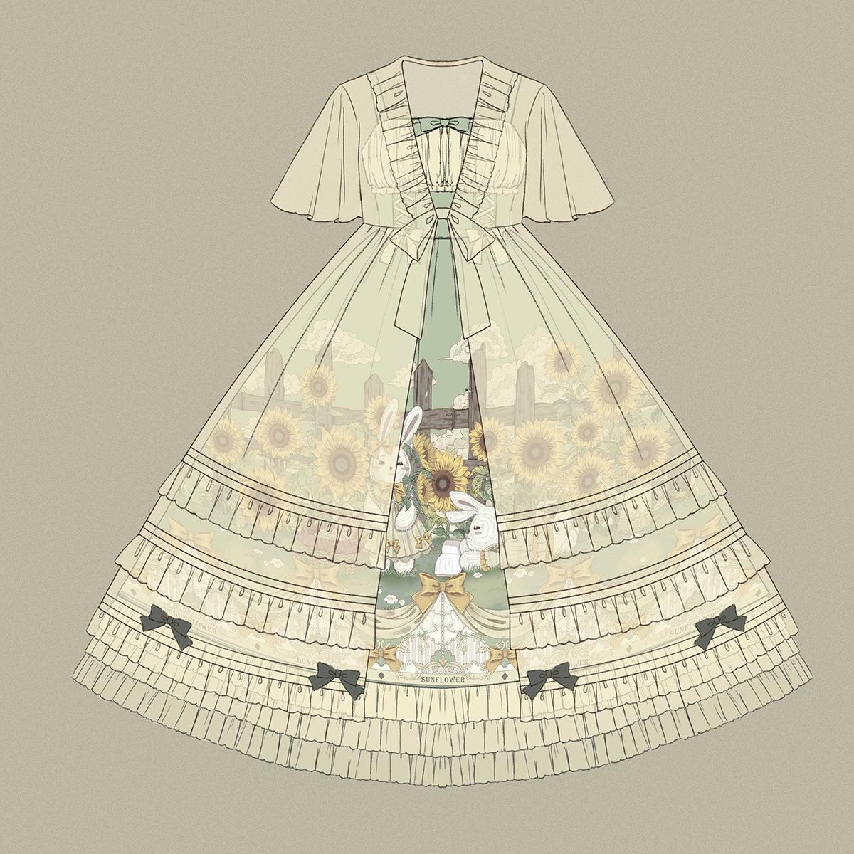 物語の中の少女をイメージした、透明感とぬくもりをあわせ持つクラシカルロリィタデザインです。ひまわり畑に佇むうさぎたちを繊細に描いた原画プリントは、優しい色調ながら存在感抜群。重ねたチュールが淡い影を作り、歩くたびにふわりと揺れて立体感が生まれます。胸元のリボンやフリル、レースアップなど可愛らしさを詰め込みつつも上品で、幅広い年代の方に似合う洗練された一着です。