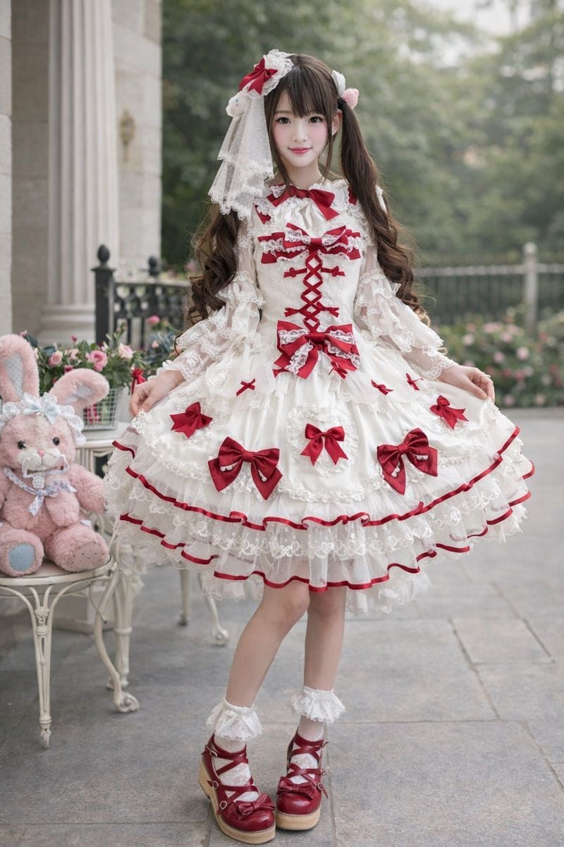 繊細なレースと立体感のあるフリル、印象的なリボン装飾をふんだんにあしらった、ドール感たっぷりのロリィタJSKです。白地に映える赤やピンクの差し色が写真映えし、着るだけで物語の主人公のような世界観が完成。イベント・撮影・お出かけまで幅広く活躍します。