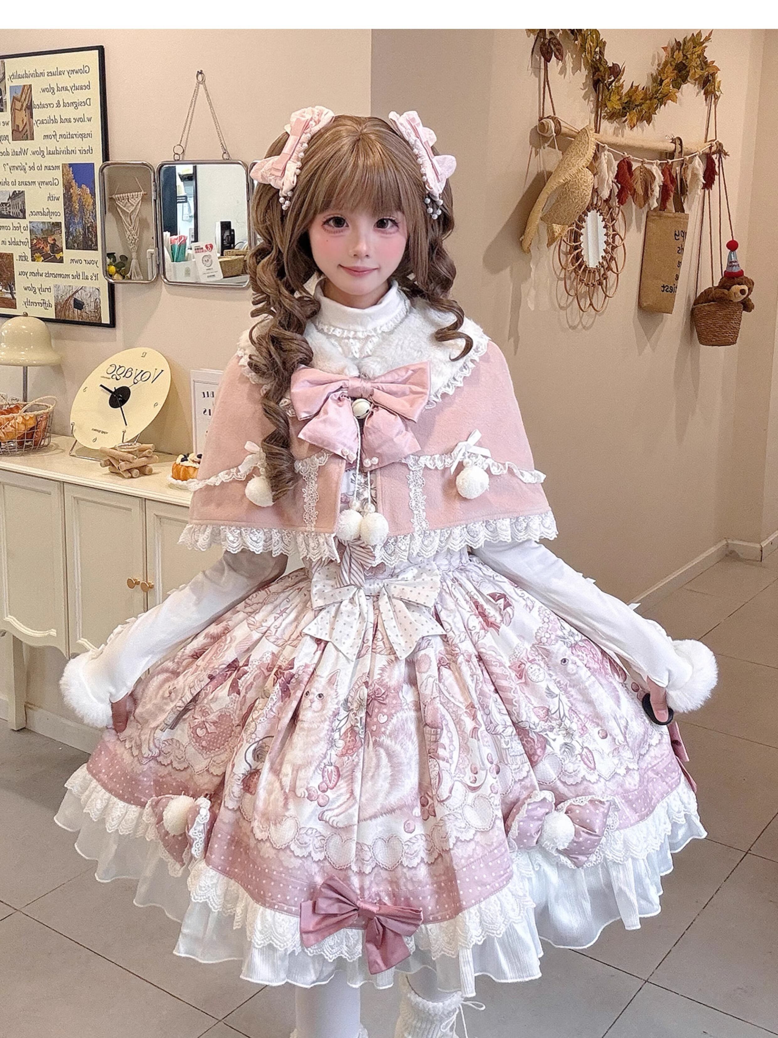 ケープとジャンパースカートの組み合わせで、秋冬らしい温もりとお姫様感を同時に楽しめるロリィタセットです。