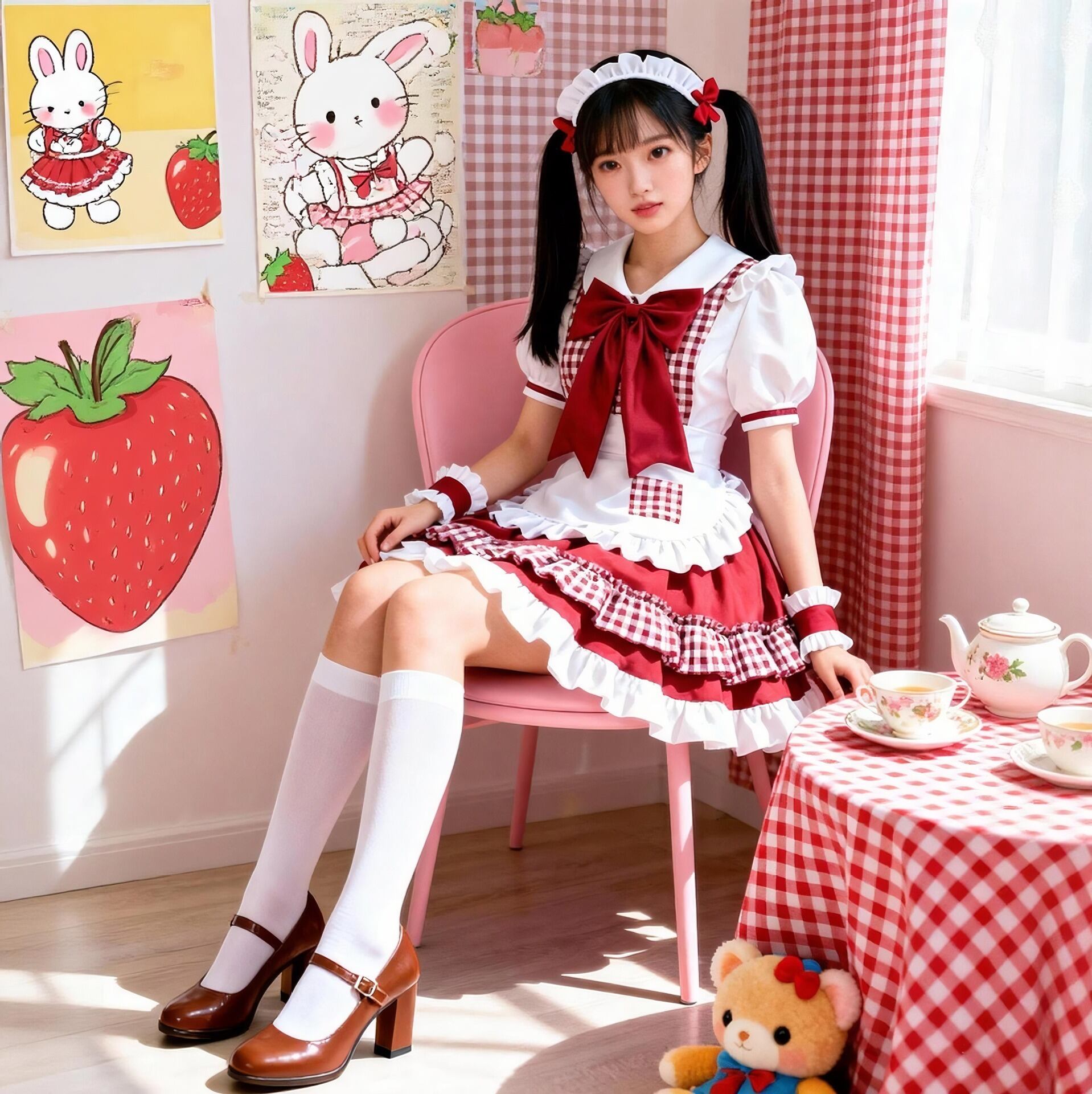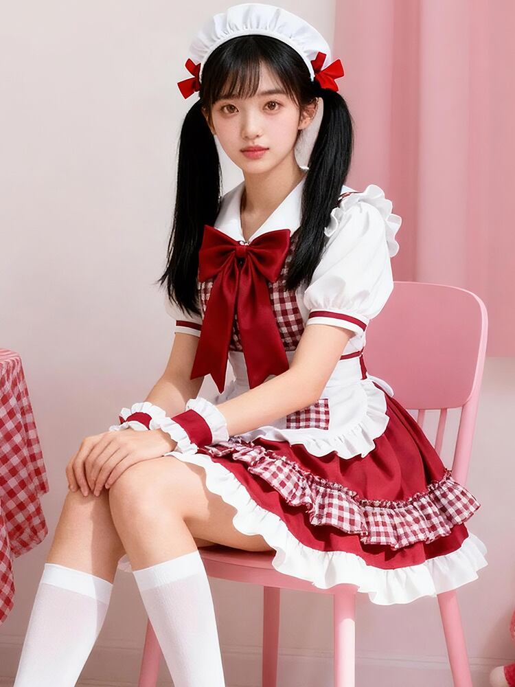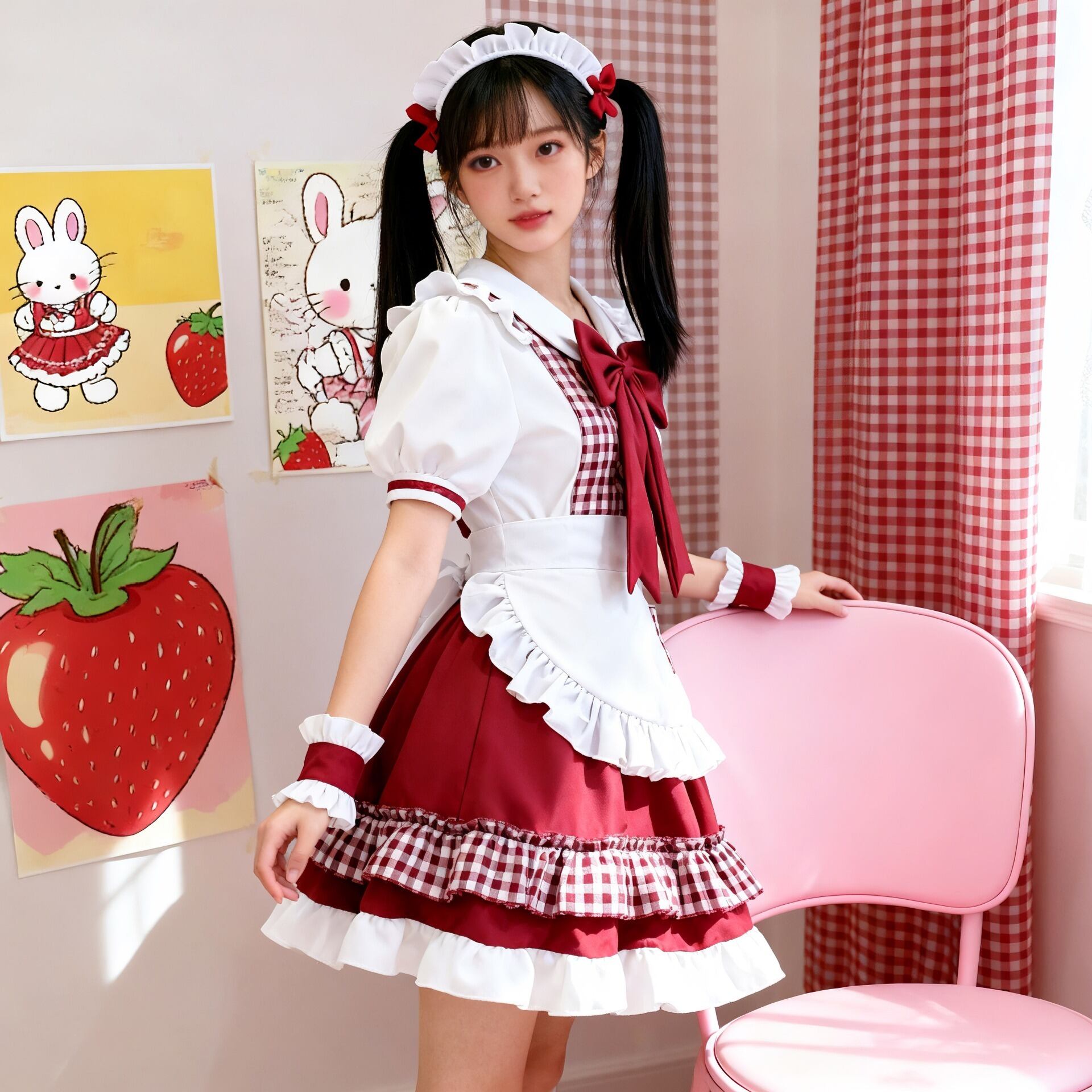 赤チェック フリルメイドワンピース フルセット ロリィタ風 ガーリーコスプレ衣装 エプロン リボン ヘッドドレス付き 撮影会 イベント 配信 ハロウィン クリスマス対応